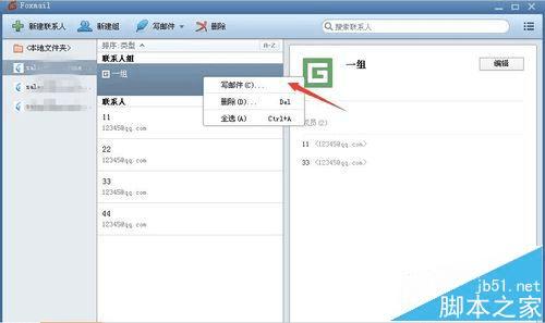 5、联系人组建好之后,选择组,鼠标右键点击,在弹出来的选项卡中选择“写邮件”选项。此时会弹出写新邮件界面,且收件人栏中已经自动加载了所有组成员的邮箱地址。