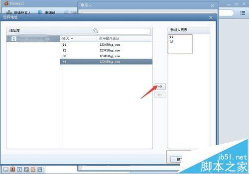 3、在“添加成员”弹出来的对话框中,可以看到邮箱所有的联系人信息,选中想要发送的联系人,通过朝右箭头移动到参与人列表中。移动完成后点击“确定”按钮。