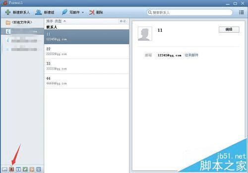 1、打开Foxmail界面后,点击切换到左下角的联系人一栏,此时可以看到邮箱中所有联系人的信息及邮箱地址。只是也可以通过“新建联系人”按钮来添加联系人信息。