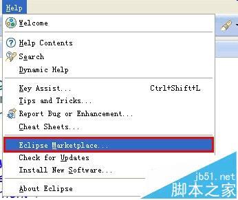 1、同样选择Eclipse-->"Help",这里选择"Eclipse MarketsPlace"这个菜单,如下图