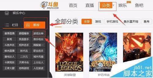 3、注册完成后,进入斗鱼TV网站。选择分类——推荐——游戏女神