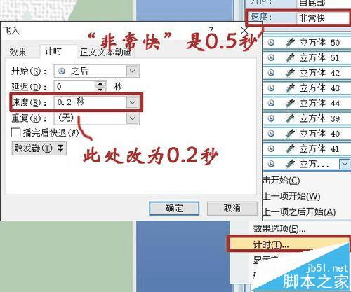 4、除了开始栏,还有方向和速度。方向栏打开自然明白,按喜好选择。速度栏里共有五种,如果符合你的需要,从中选择即可。如果没有想要的速度怎么办?那么对着这些动画效果右键——计时,看到速度选项吗?输入数值即可。
