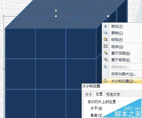 4、选中复制的立方体,右键——大小和位置里,锁定纵横比,缩放比例其中任一个中输入33.33333%(呵呵,三分之一)。填充上颜色(随个人喜好)。