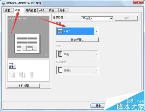2、然后选择打印机属性的布局(如下图)→组合 选择2合一(如下图)点确定