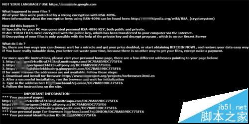4、用百度翻译翻译这些内容,会看到病毒作者想要比特币。