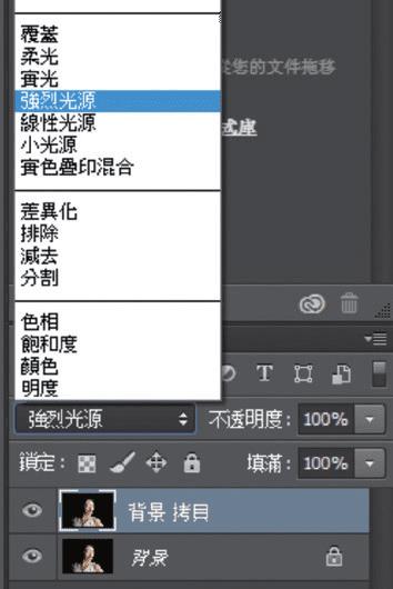 接着,我们改变图层混合模式,在混合模式面板选择「强烈光源」,这样照片变得反差强烈,颜色浓郁。这个也是必须步骤,不用担心,之后修改画面会重现正常。