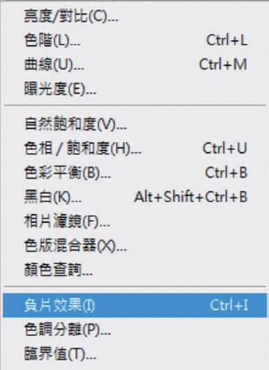 将照片反相,选择「图像」→「调整」→「负片效果」。以前用多个图层制作时,每个图层都需要反相,并设定各自的混合模式,现在反而简单得多,只需要在一个图层上选择反相就可以。