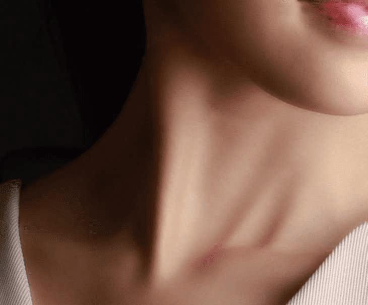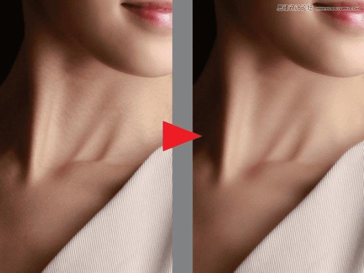除了面部,身上皮肤也需要柔化,不然面部处理过,而脖颈保持原样的话,效果会很违和。我们用笔刷擦过之后,人物皮肤就会有明显改善。