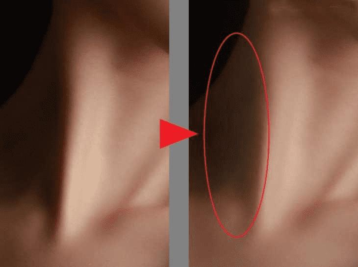 另外是颈部的暗部,如果拍摄时利用侧光的角度,一定会留下这种阴影,如果想淡色一点,也可以用这个方法,取样邻近光位的肤色,调整阴影的浓度,效果也不错。