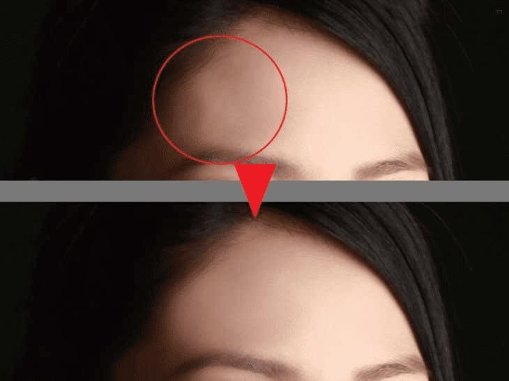首先是额头的光暗不均匀,这里是脸上最碍眼的地方,我们取样邻近的光位,直接在额头扫过,笔刷的不透明度要降低,多扫几下就会见到肤色被调匀。