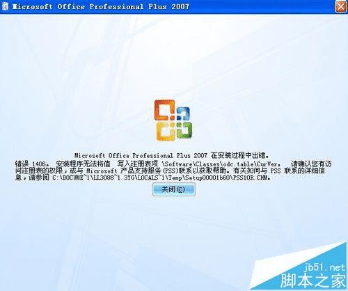 1、我们在安装office 2007的时候,会出现以下信息,错误1406,安装程序无法将值写入注册表项,需要联系管理员权限,导致无法安装