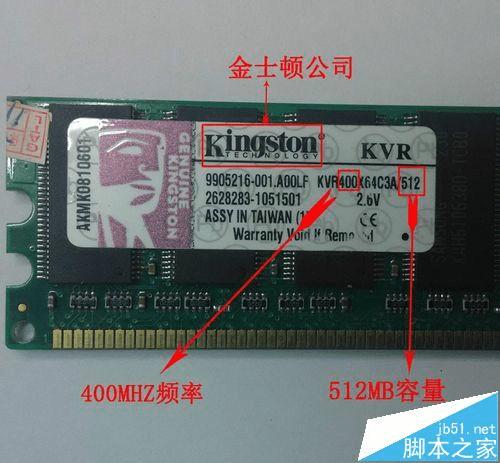 2、仔细看看内存条上的标签,首先,这是一条金士顿牌子的内存条,频率为400MHZ,容量只有512M,也就是0.5G。频率才是关键。一代内存条的频率有333MHZ和400MHZ,所以标签上的“400”就足以证明它是一代内存条。容量不是关键,一代内存条有1G容量的,三代内存条也有1G容量的。