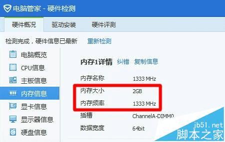 9、当然,正在使用的电脑,想要知道内存条的类型,不需要把内存条拔出来。只需借助一些硬件检测软件,可以很方便地查看内存条的容量,频率。瞧瞧我用“腾讯电脑管家”的“硬件检测”工具检测出来的内存信息。可以看出,我的内存条是三代2G的内存条。