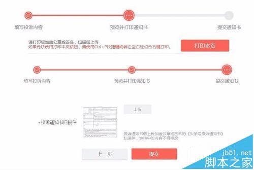 5、填写并上传投诉资料,生成打印通知书,上传加盖公章或签名的通知书。提交后审核人员进行审核并反馈结果。
