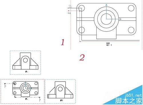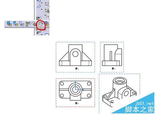 有一点需要注意的就是,请注意图中每个二维图都带有一个虚线框,当你想对视图进行“投影视图”和“偏移剖视图”操作时,务必确保你所要投影的主视图和你想画剖切线的视图虚线框为红色,蓝色虚线框是未激活的视图,当前不可操作。