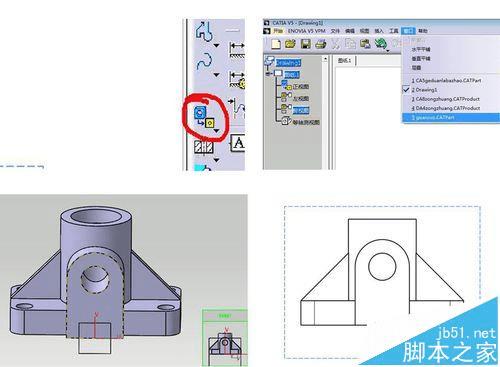 2、找到如图所示的“正视图”按钮,并单击。然后从菜单栏中的“窗口”工具返回三维文件所在的界面,在零件上想要成为主视图的平面上单击一下,CATIA就会自动回到工程图模块,此时再在空白位置单击一下鼠标左键即可放置主视图投影。