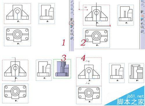 5、利用同样的步骤可以在俯视图中进行剖切,得到主视图的部分剖视图。图中带箭头的红线是我点击鼠标的顺序和画线方向。