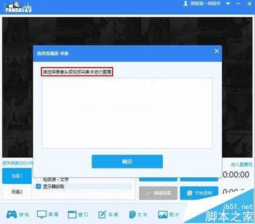 点击“采集”,助手会提示添加直播源,直播源可以是摄像头或者视频采集卡,主播可以自行选择进行直播。
