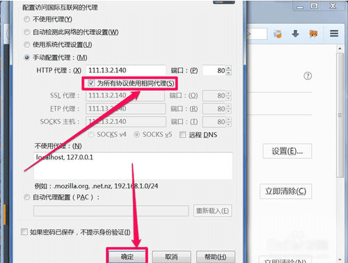 火狐浏览器设置IP代理的方法 来源:www.45fan.com 2016-10-16 12:26:35 火狐浏览器设置IP代理的方法 首先打开浏览器,在右上角 击“三”图标,打开主菜单。 在主菜单界面,选择“选项”这一个。 进入选项窗口后,选择最下端的“高级”这个选项。 在高级的子菜单项中,选择“网络”这个子项。 进入网络子项,有个“连接”项目,这个是设置IP代理的选项,点击右侧的“设置”按钮。 会弹出一个子窗口,默认的情况,是使用系统的的代理设置。 要手动设置自定义的IP代理,则需选择“手动配置代理”,并在下面的HTTP代理和端品后面,填上IP地址和端口。 然后勾选下面的“为所有协议使用相同代理”,并按确定,就设置完成了。 注意事项: 要事先准备好IP地址,而且是要有效的IP地址。 注意一下,设置了IP代理,有的网站就上不去了,在不使用IP代理时,最好取消IP代理。 推荐阅读 如何下载win10 Build 10565中Edge浏览器 让非IE浏览器也能正常浏览的方法 在Win10系统中将迅雷设为360浏览器默认下 开启edge浏览器中的发送请勿跟踪请求功能 Win10预览版14316中Edge浏览器更新内容 将qq浏览器的收藏夹中的书签导入Edge中的 Win10 Edge浏览器中不常用的四个隐藏设置 Win10 Mobile预览版10572中edge浏览器的 解决IE浏览器打开页面出错提示无法匿名级 如何处理win7 64位系统只有搜狗浏览器可