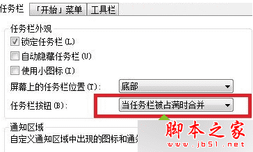 2、在弹出的窗口中找到:“任务栏按钮(B)”选项,将右面的菜单下拉选择“从不合并”;