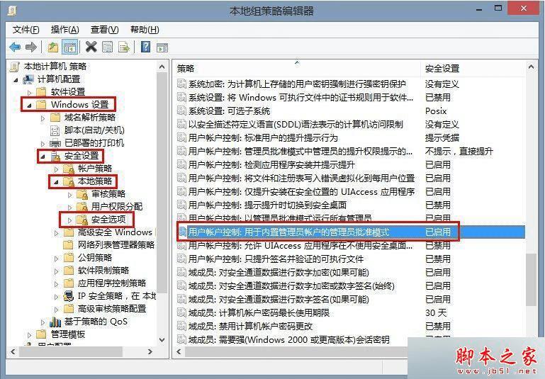 2、在”本地策略编辑器”窗口左侧依次展开“计算机配置-Windows设置 -安全设置 -本地策略-安全选项。点击“安全选项”后,我们在窗口右边找到“用户帐户控制:用于内置管理员账户的管理员批准模式”;