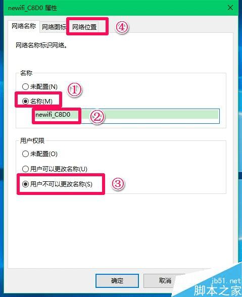在newifi_C8D0 属性-网络名称窗口:①点击名称(M),②在名称栏输入newifi_C8D0,③点击【用户权限】下的【用户不可以更改名称】,④点击【网络位置】;