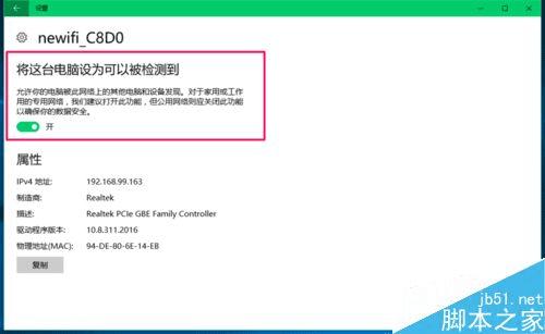 如果能将newifi_C8D0 的网络属性【公用网络】更改为【专用网络】,则Windows10-14367版系统的【将这台电脑设为可以被检测到】的开关就可以设置为【开】的位置。