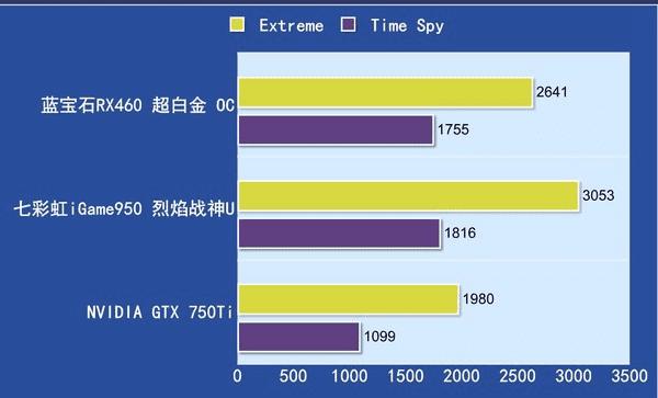 理论测试小结:在3DMark两项理论性能测试中,蓝宝石RX460 超白金 OC大幅度领先GTX750Ti自是不必说了,跑分性能十分接近七彩虹iGame950 烈焰战神U,尤其是在Time Spy这项DX12的基准测试上。