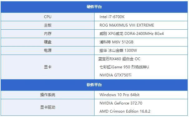 平台说明:测试平台方面采用的是消费级平台Z170+6700K顶配,本次测试一共选用了三块显卡进行对比测试,分别为蓝宝石RX460 超白金 OC、七彩虹iGame950 烈焰战神U和NVIDIA GTX750Ti,驱动方面为最新的AMDCrimson Edition 16.8.2以及NVIDIAForceWare372.70 WHQL。