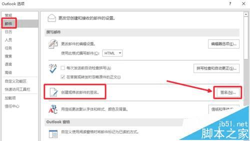 3、Outlook选项界面,左侧点击邮件,然后右边选择签名进入。
