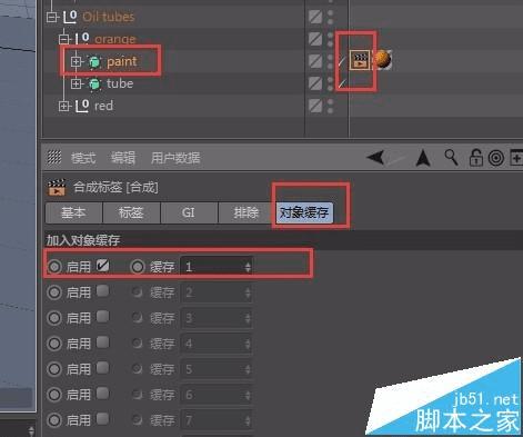 3、接下来,对合成标签进行设置,打开对象缓存,然后将启用打开设置缓存的ID号。