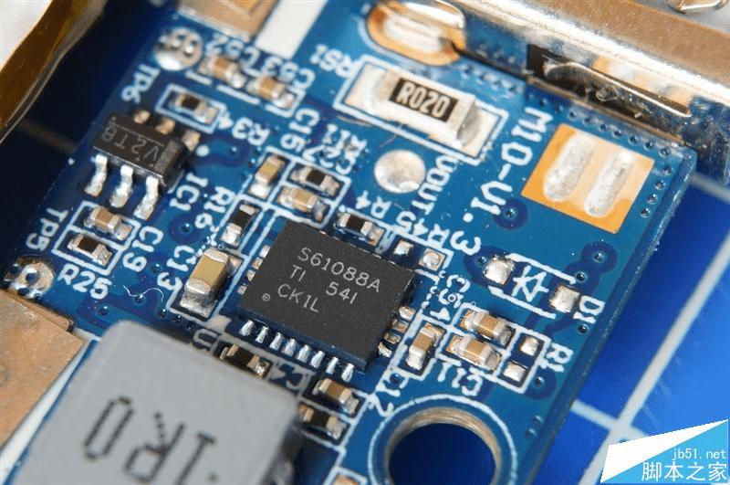 升压部分用的TITPS61088,性能会在下面的放电测试中揭晓。他支持2.7V-12V电池电压,升压后可达4.5V-12.6V,这个电压段足够满足高通QuickCharge2.0和MTKPumpExpress Plus的宽电压输出范围。TPS61088上方的R020电阻,是移动电源检测输出电流的原件,通常移动电源中采用的都是50毫欧的电阻,在2A输出下,有100mV,也就是0.1V的压降,降低输出电压。