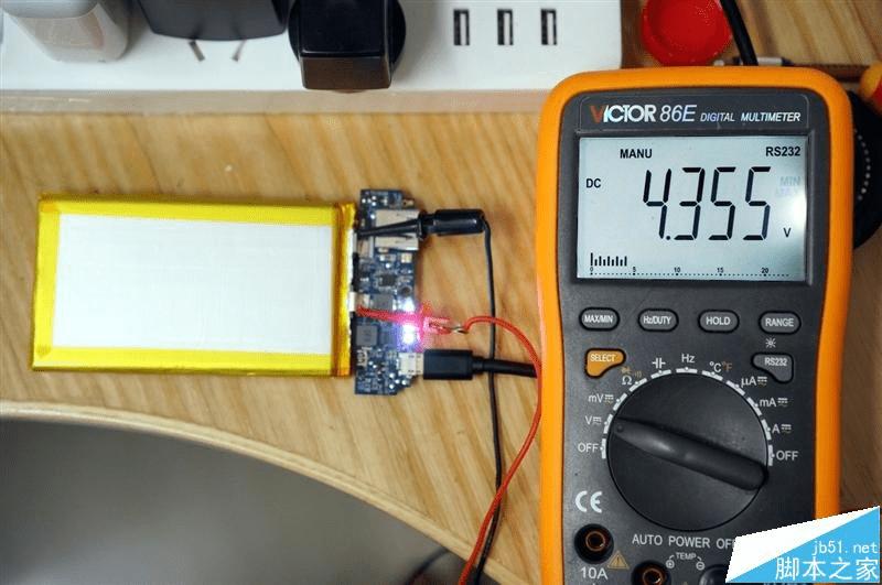 为了验证内部电池组的充电截止电压,我们将万用表夹在电池组的正负极,当魅族移动电源(快充版)四颗指示灯常亮时,得出充电截止电压4.355V。在快充移动电源中由于升压电压落差大,用高压电芯对效率有帮助。