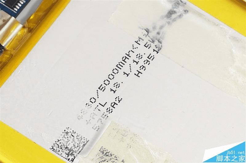 电池组共有两片,用麦拉片(高温胶)粘贴组成。电芯品牌为ATL,容量标准了两个指标,分别是典型电容5000mAh(18.5Wh),最低容量4880mAh(18.1Wh),电压平台3.7V,型号5758A2。左侧的二维码用于原厂追溯生产批次和出厂日期。