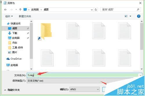 3、然后,我们 按下 快捷键 ctrl + s 保存,在弹出的保存对话框中我们要注意,这里我们要保存的后缀名不是.txt ,而是 .reg 文件,所以我命名为 1.reg,这里我把文件保存在桌面上