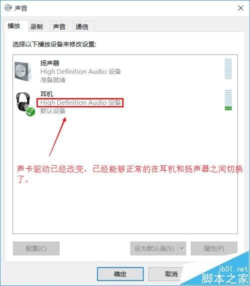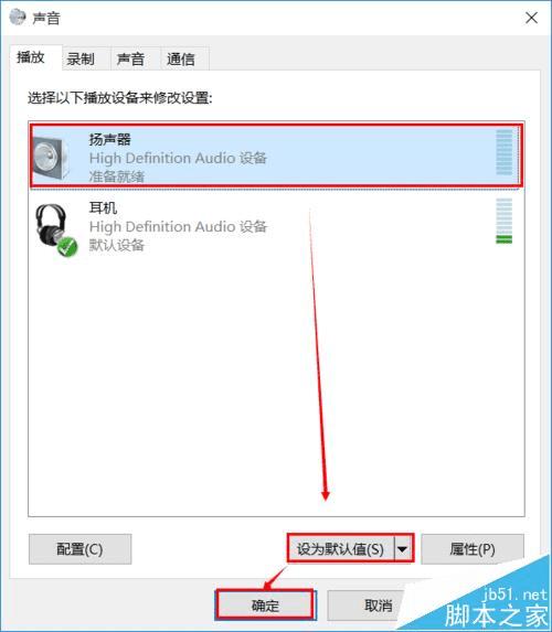 2、如果你很少在耳机和扬声器之间切换,则解决问题很简单,用的时候手动切换一下即可,当然这也是治标不治本。先说手动切换吧,使用耳机时,就选中耳机,然后点击’设为默认值‘,使用扬声器时,就选中扬声器,然后设为’设为默认值‘。