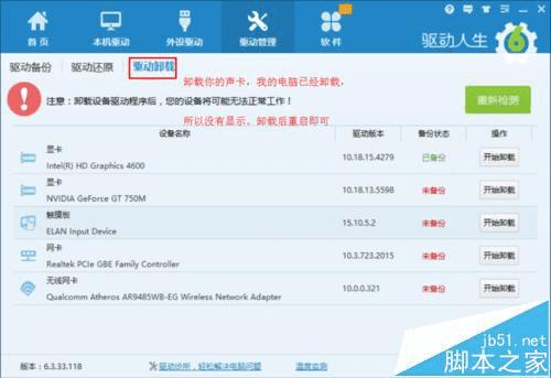 7、然后打开驱动人生,卸载声卡驱动。重启电脑。