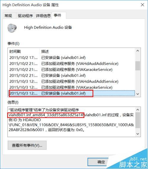 4、常规---->属性,在跳出来的窗口中,选择 “事件”。在事件中,拉到最下面,找到“已安装设备(viahdb01.inf)”,点击这一栏,找到该文件所在的文件夹,如图。