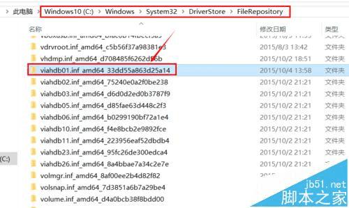 5、到系统文件中C:\Windows\System32\DriverStore\FileRepository找到该文件夹,(貌似每个人的这个文件夹名称都一样是:viahdb01.inf_amd64_33dd55a863d25a14,如果你的不是,请一上一步中的文件夹为准)。