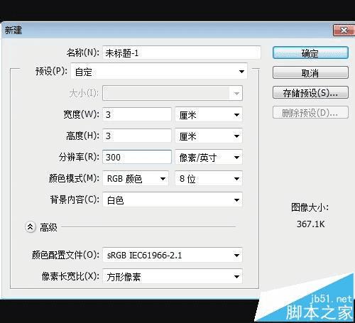 7、新建一个3厘米X3厘米,300像素/英寸,也就是和打印一个分辨率的打印文档。