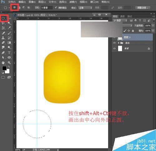 2、我们先来画小黄人的眼镜,再来画小黄人的眼睛。新建一个空白图层图层2,任意拉出两条参考线,方便我们画出同心圆。选择工具箱中的椭圆选框工具,按住shift+Ctrl+Alt键,由两条参考线的中间拉出一个正圆,效果如下图。