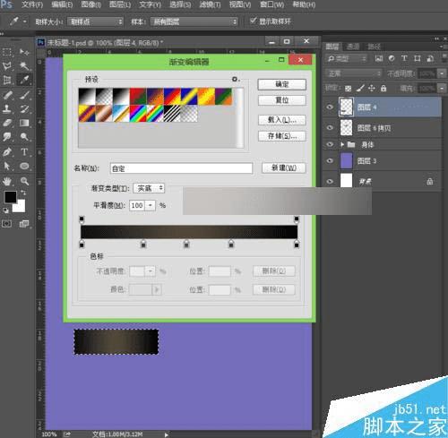 9、我们再来画眼镜架。新建一个空白图层,选择工具箱中的矩形选框工具,画一个小矩形,我们来给矩形添加一个渐变,渐变选择黑色到灰色到黑色的渐变,渐变方式选择径向渐变,在矩形左边到右边拉出一个渐变。