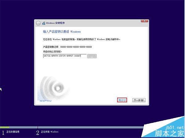 ▲此处可用安装密钥RHGJR-N7FVY-Q3B8F-KBQ6V-46YP4(只用于专业版安装,激活无效),输入后点击“下一步”继续;也可以点击“跳过”,在安装完成后输入激活密钥