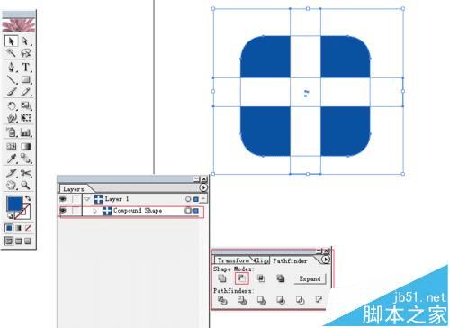 2、上一步的图有3个图层,现在我们要把这三个图层合并成一个,组成复合路径,使用路径查找器(Pathfinder)工具进行操作。选中三个图形,我使用了减去功能,这样就在底图上扣去,到现在,原来的三个图层成为了一个复合路径图层。