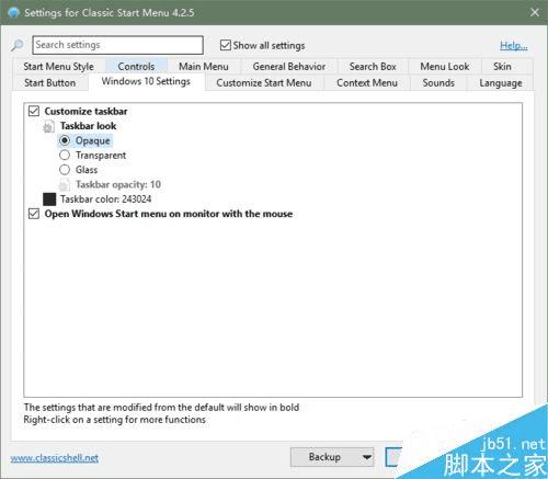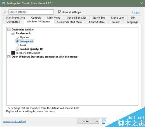 我们切换到Windows 10 Setting选项卡,发现在Taskbar look下面有四项内容,Opaque是模糊,Transparent是全透明,Glass是玻璃效果,选中此项后可以在下面的Taskbar opacity调整透明度。