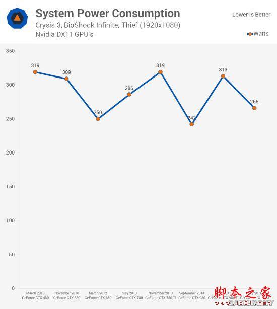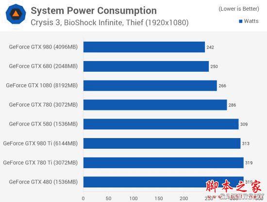 在游戏功耗测试中,可以看到GTX 980的功耗最低,而初代GTX 480的功耗最高,为319W。相对来说比较省电的是各代的小核心,而完整版核心的N卡照样功耗感人。