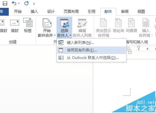 5、点击“邮件”然后点击“选择收件人” 最后选择“使用现在有列表……”