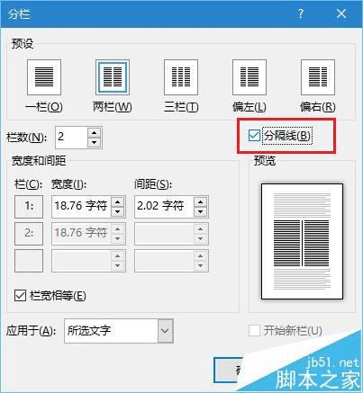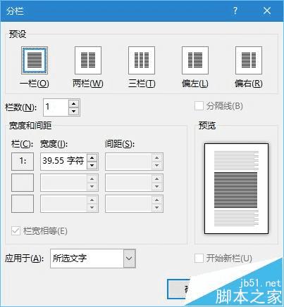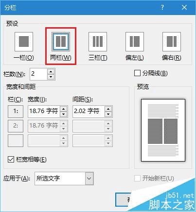 7、应用于选项一定要是“所选文字”,不然整篇文章都会成为两栏。