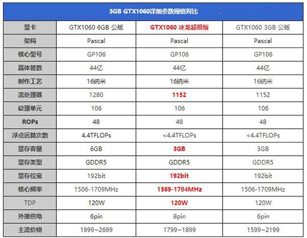GTX1060 3GB和6GB版本,主要就是显存和流处理器差异,至于显存频率和核心频率,这是看第三方显卡厂商的水平来调整的,这也是厂商唯一可以做文章之处,不同品牌的型号频率会有所不同,不过顶到天也就相差两三百M,也就是说任何品牌型号性能差异不大。