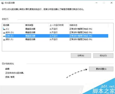 选择需要优化的磁盘,点击“更改设置”按钮;